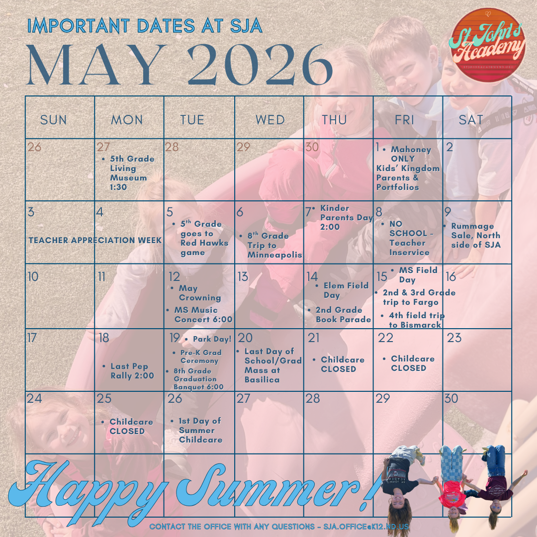 - May 20th - Last Day of School & Graduation Mass at St. James Basilica